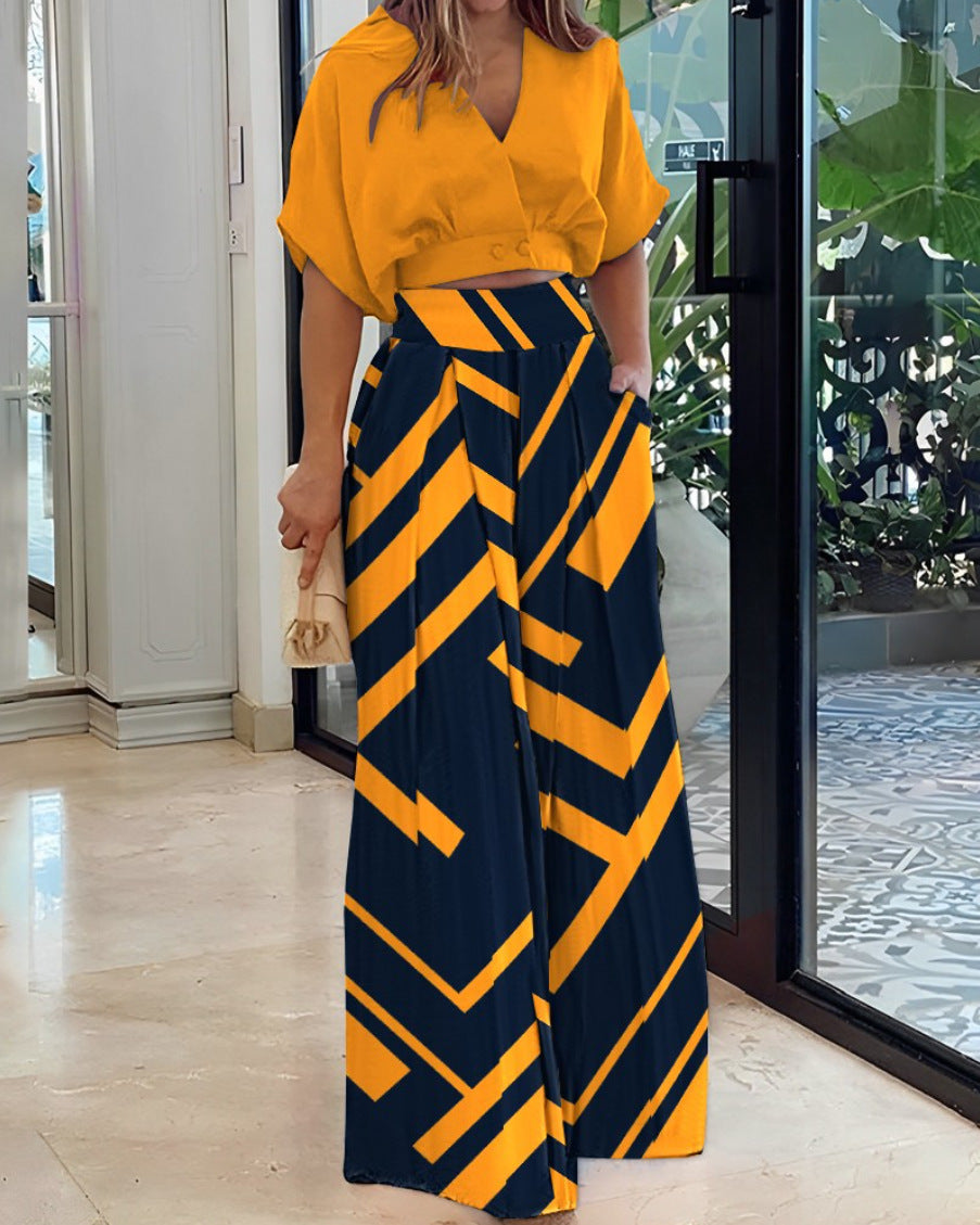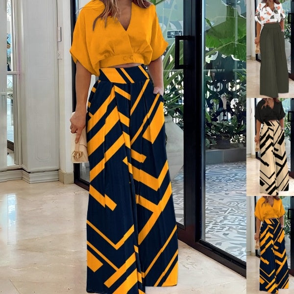 fall 2023 women clothes Temperament commuter V neck short sleeved top pattern printed womens two piece pants set