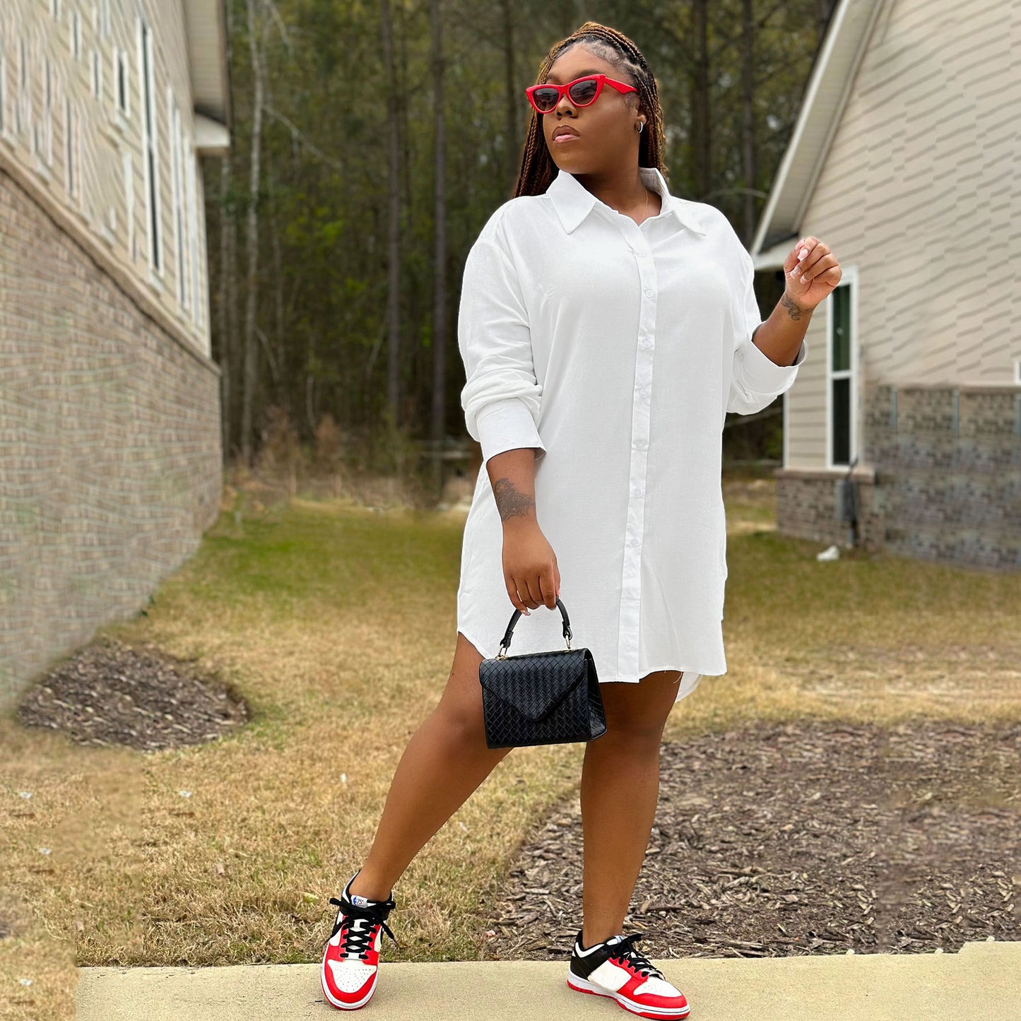Ladies L-5XL Solid Plus Size Shirt Dress Blank White Fat Woman Long Sleeve Single Breasted Dresses Oversized Women Clothing