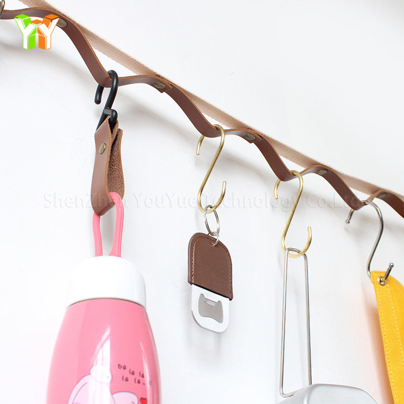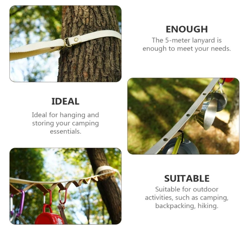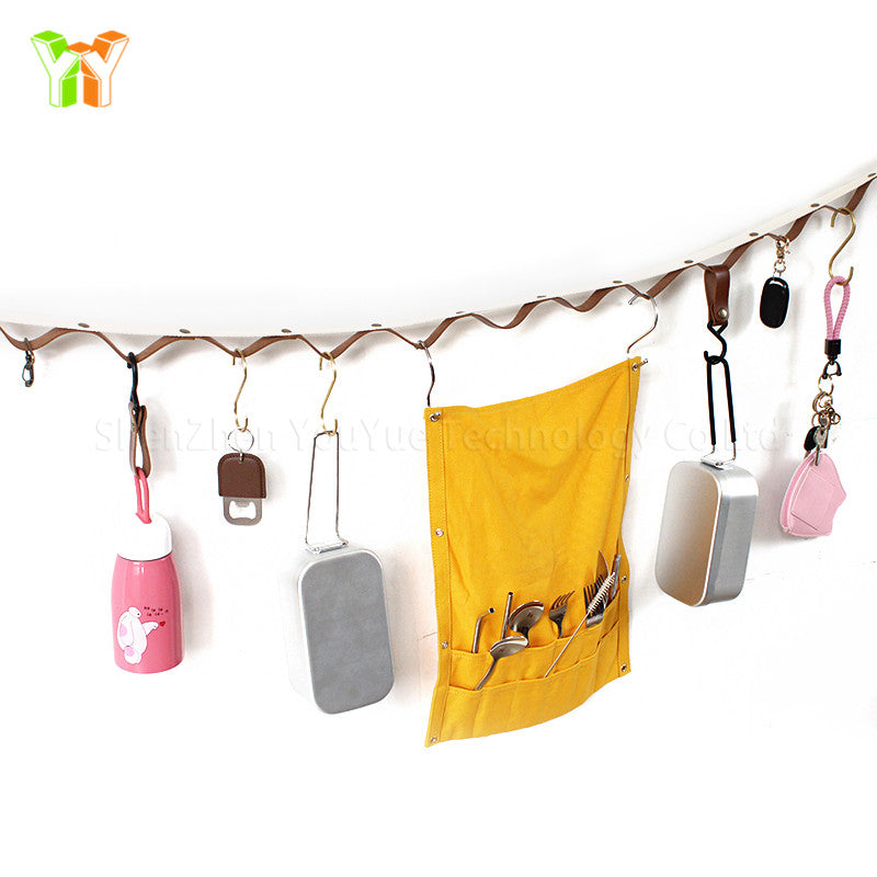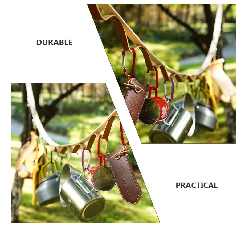 Made of premium leather tape, it is strong and durable. It can hang various sizes of camping gear, kitchen utensils, backpacks, clothes, tents, etc. Rain or shine. can hold up to 150 Ibs.